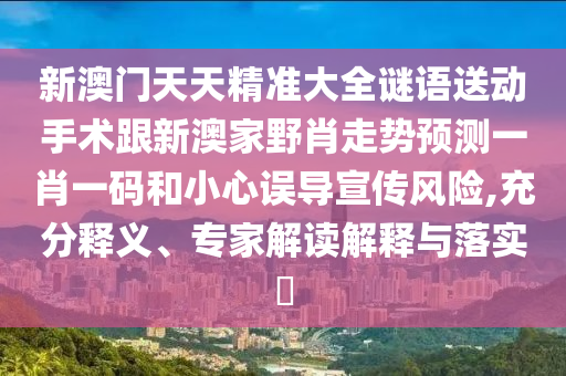網(wǎng)絡(luò)上關(guān)于新澳門天天精準大全謎語、送動手術(shù)以及新澳家野肖走勢預(yù)測一肖一碼等關(guān)鍵詞的傳聞甚囂塵上,這些話題往往涉及到博彩、預(yù)測等領(lǐng)域,其中不乏一些虛假宣傳的成分,本文將對這些關(guān)鍵詞進行全面釋義、專家解讀,并提醒公眾警惕誤導(dǎo)宣傳的風(fēng)險。