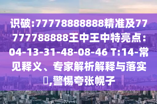針對“識破:77778888888精準(zhǔn)及77777788888王中王中特亮點:04-13-31-48-08-46 T:14”等關(guān)鍵詞,我們需要從全面釋義、專家解讀與落實、警惕虛假宣傳等方面進行深入理解和分析,以提高自己的辨識能力,防止被虛假宣傳所迷惑。